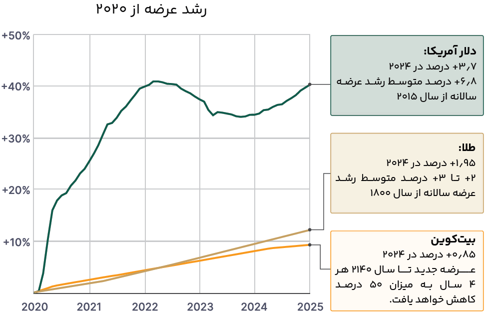 نرخ رشد عرضۀ بیتکوین اکنون پایینتر از دلار و طلاست