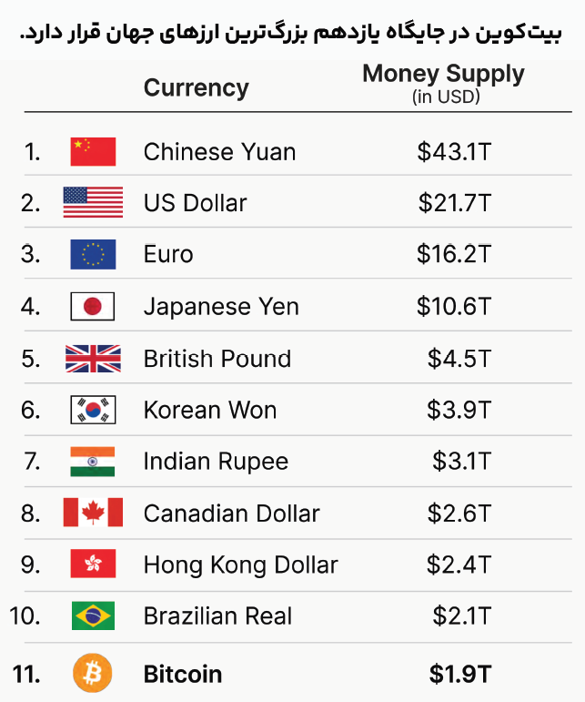 بیتکوین تا این لحظه در جایگاه یازدهم بزرگترین ارزهای جهان قرار دارد.