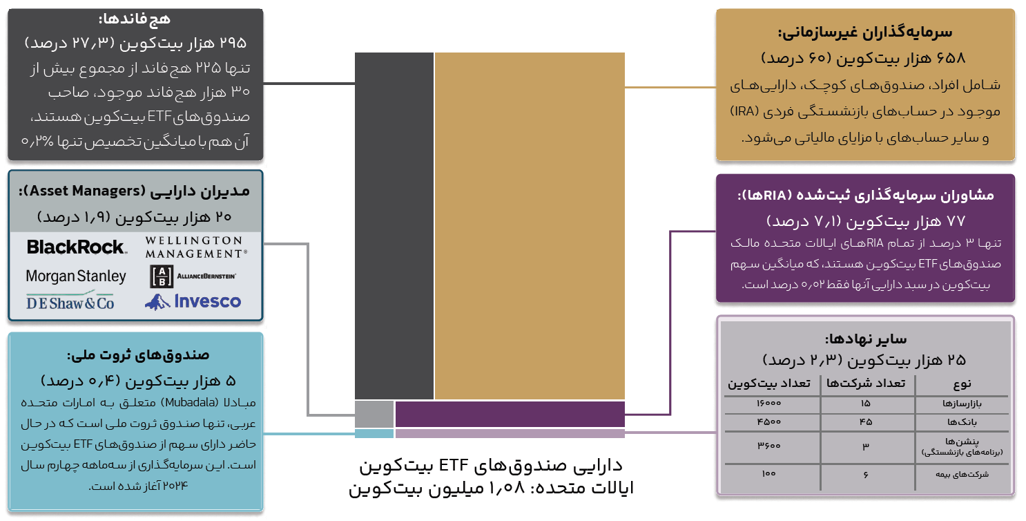 برخلاف چرخههای قبلی که سرمایهگذاران خرد محرک اصلی بودند، در سال 2024 صندوقهای سرمایهگذاری قابل معامله بیتکوین (ETF) و کسبوکارها خریداران اصلی بیتکوین بودند.