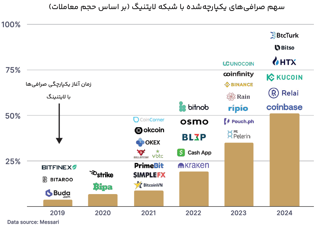 از سال 2023، پذیرش توسط صرافیها عامل اصلی رشد شبکه لایتنینگ بوده است و اکنون طبق برآوردهای ما، حداقل دوسوم از کل ارزشی که از طریق شبکه لایتنینگ روت میشود مربوط به صرافیهاست.