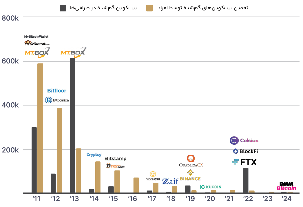 بیش از 1.3 میلیون بیتکوین در صرافیها بر اثر هک، سرقت داخلی و ورشکستگی به خطر افتادهاند.