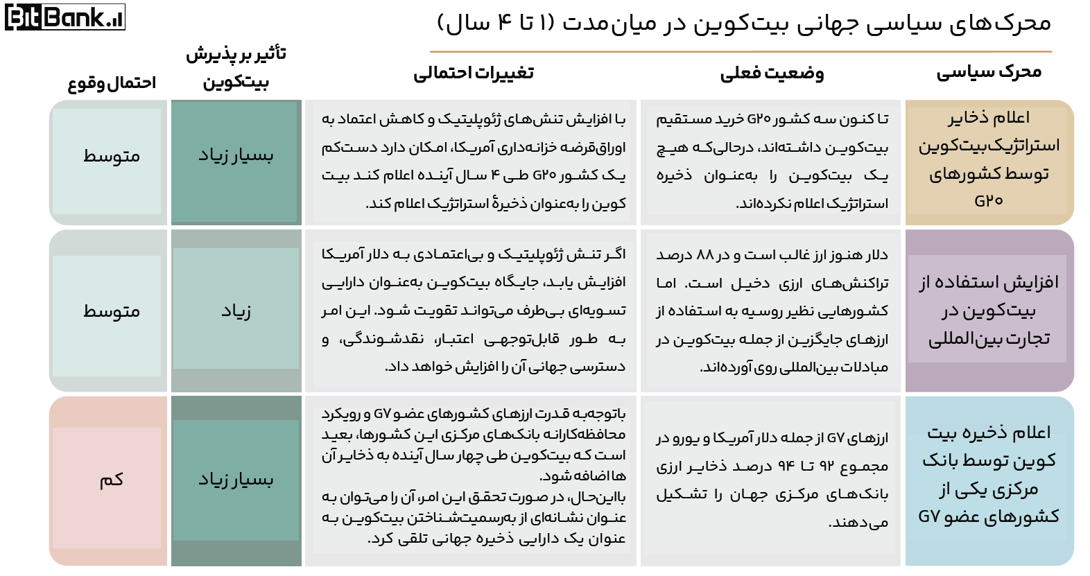 محرکهای سیاسی جهانی بیتکوین در میانمدت (۱ تا ۴ سال)