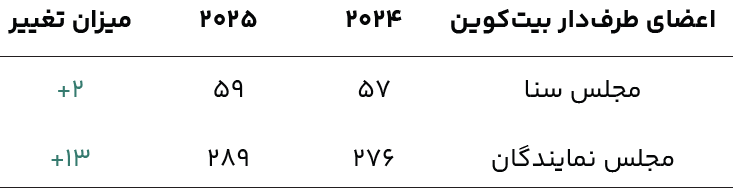 طبق گزارش Stand With Crypto پس از انتخابات نوامبر ۲۰۲۴، تعداد طرفداران بیتکوین (بر اساس اظهارات عمومی و فعالیتهای سیاسی) در هر دو مجلس نمایندگان و سنا اکنون به اکثریت رسیده است.