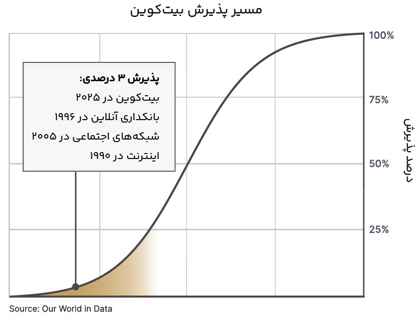 در سال ۲۰۲۵، تنها سه درصد از ظرفیت بالقوۀ پذیرش بیتکوین بالفعل شده است. اصطلاح «پذیرش» فراتر از قیمت بیتکوین یا سطوح مالکیت آن است. این واژه بازتابدهنده ترکیبی از عوامل مختلف است. این برآورد سه درصدی حاصل ترکیبی از شاخصهای کلیدی، از جمله این موارد است: