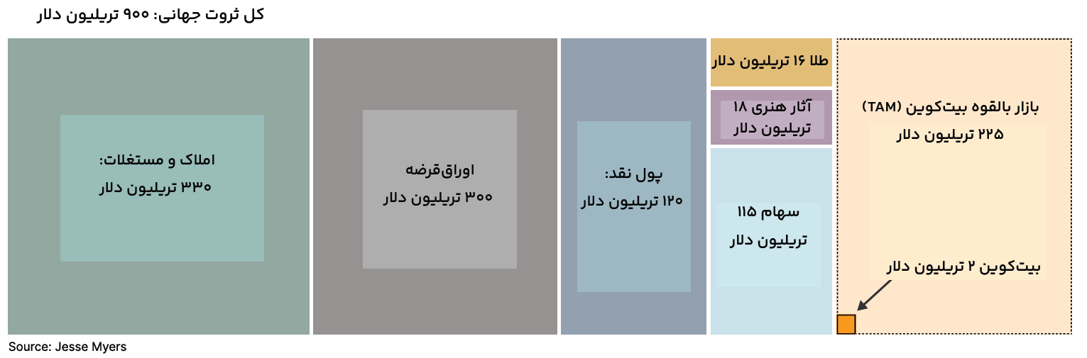 بازار کل قابلدستیابی (TAM): ارزش بازار بیتکوین هنوز کمتر از یک درصد از برآورد بازار کل قابلدستیابی آن است.