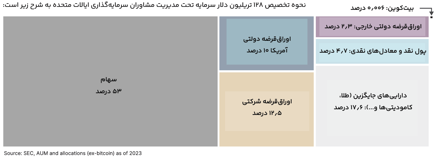 اختصاص ناکافی توسط نهادهای مالی: مشاوران سرمایهگذاری مستقر در ایالاتمتحده در مجموع فقط 0.006 درصد از سبدهای سرمایهگذاری خود را به بیتکوین اختصاص دادهاند.