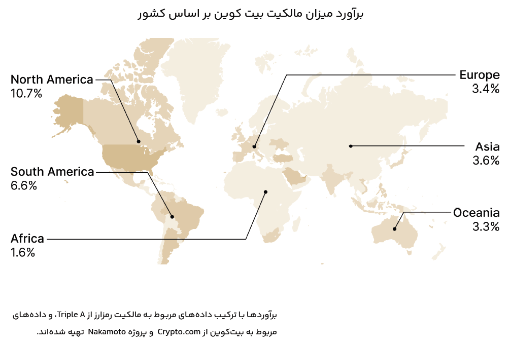 مالکیت جهانی: در حالی که 14 درصد از آمریکاییها مقداری بیتکوین دارند، مالکیت جهانی همچنان کمتر از 4 درصد باقی مانده است.