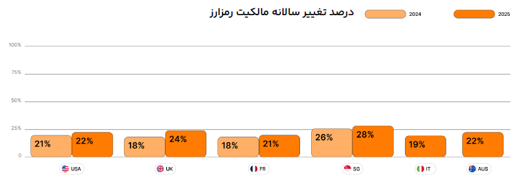 در سال ۲۰۲۵، میزان مالکیت رمزارز در بریتانیا به 24 درصد رسید که بالاتر از عدد 18 درصد سال 2024 است. در ایالاتمتحده نیز این نرخ با رشد اندکی به 22 درصد رسید، در حالی که رقم سال پیش 21 درصد بود. فرانسه با افزایشی نسبتاً قابلتوجه، به نرخ مالکیت 21 درصد رسید (در مقایسه با 18 درصد در سال ۲۰۲۴) و سنگاپور با نرخ 28 درصد، در برابر 26 درصد سال گذشته، در صدر جدول قرار دارد.