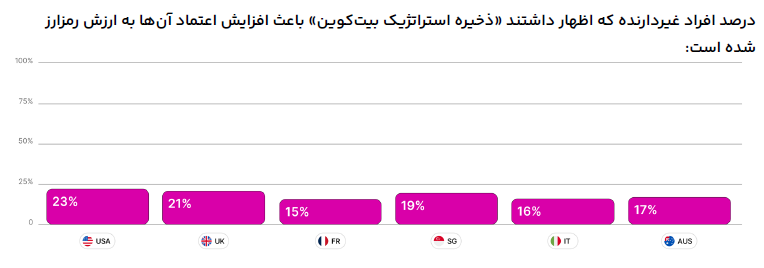 نزدیک به یکچهارم (23 درصد) از افرادی که در ایالاتمتحده صاحب رمزارز نبودند، اظهار داشتند که راهاندازی «ذخیره استراتژیک بیتکوین» توسط رئیسجمهور ترامپ، اعتماد آنها را به ارزش رمزارزها افزایش داده است. همین احساس در میان چنین افرادی در بریتانیا و سنگاپور نیز دیده میشود، بهطوری که تقریباً یک نفر از هر پنج نفر (به ترتیب 21 و 19 درصد) اعلام کردند که این اقدام باعث افزایش اعتمادشان شده است.