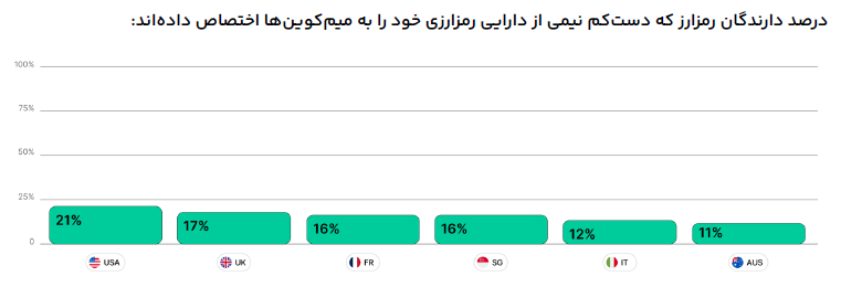 فرانسه پیشتاز پذیرش میمکوین: در فرانسه، 67 درصد از سرمایهگذاران رمزارزی، میمکوین دارند. پس از آن سنگاپور با 59 درصد، ایتالیا با 58 درصد، بریتانیا با 57 درصد، ایالاتمتحده با 55 درصد و استرالیا با 45 درصد قرار دارند.