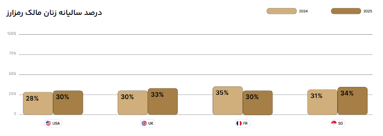 مشابه آنچه در نظام مالی سنتی دیده میشود، فضای رمزارزها نیز تا مدتها عمدتاً در اختیار مردان بوده است. با این حال، زنان در سراسر جهان به طور فزایندهای به سرمایهگذاری در رمزارز روی آوردهاند و این امر موجب کاهش شکاف مالکیت میان زنان و مردان در اکثر کشورهای موردبررسی شده است.