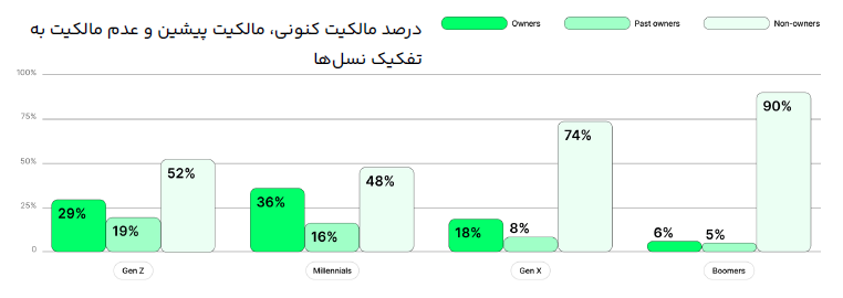 روایت رایج این است که مالکیت رمزارز در میان جوانان رواج بیشتری دارد و این موضوع تا حد زیادی صحیح است. حدود نیمی از پاسخدهندگان نسل زد و نسل هزاره (بین سنین ۱۸ تا ۲۸ سال) در سطح جهانی گفتهاند که یا در حال حاضر مالک رمزارز هستند یا پیشتر مالک بودهاند. این نسبت به ترتیب 52 درصد برای نسل هزاره و 48 درصد برای نسل زد بوده است؛ آماری که بهمراتب بالاتر از میانگین مالکیت در کل جمعیت جهانی (35 درصد) است. در مقابل، نسل ایکس و بیبیبومرها نرخ بسیار پایینتری از مالکیت یا مالکیت پیشین رمزارز داشتهاند (به ترتیب 26 و 11 درصد).